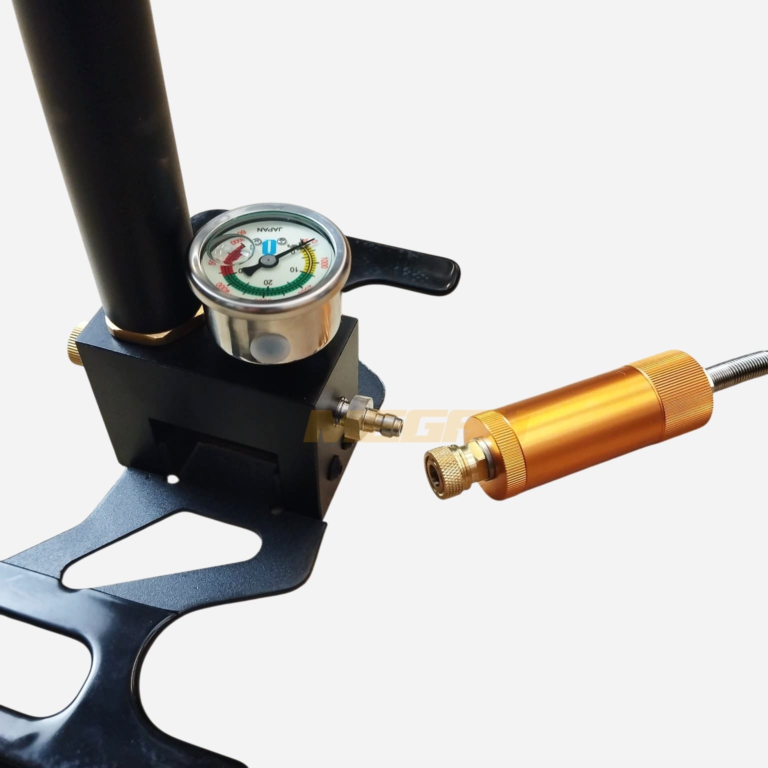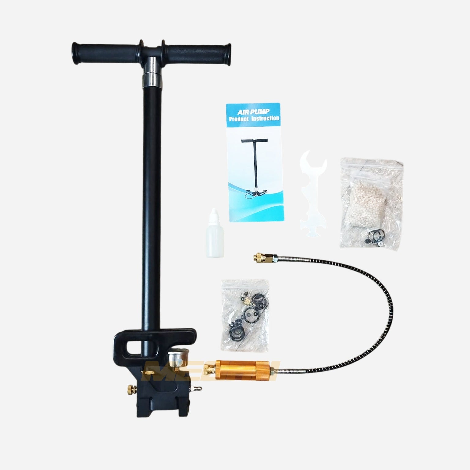 Pompa untuk mengisi angin pada tabung senapan PCP. Dengan manometer ukuran tekanan agar bisa memastikan tekanan yang pas dan aman pada unit PCP. Kapasitas max tekanan adalah 3500 psi / 241.3 Bar.
